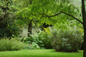 The first sight of the park was rather lightgreen, almost spring like. It was like May! It must be the rain and the mist which soften the colours. Here is a white Hortensia. I had one like this in my garden once, but there are many Hortensias in the parks and the gardens now, mostly the blue and the pink with giant round heads. Very decorative, but I'm not sure they are the best flowers for insects! Sorry! They are very lovely, but although they want much water ,they cannot endure all the heavy rain, which has been pouring down lately. It is the second-wettest summer since the weather-folks began counting the rain-millimeters.